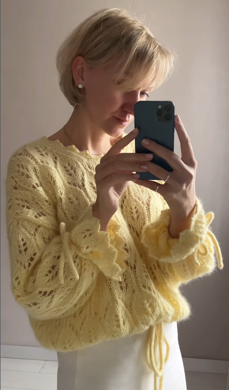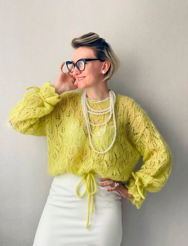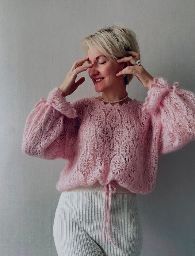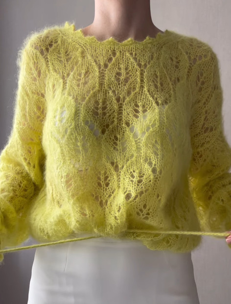 Also possible to knit the jumper from mohair on silk (215m/25 g) in 2 strands. Consumption for size S-M – 6 balls, for size M-L – 7 balls
