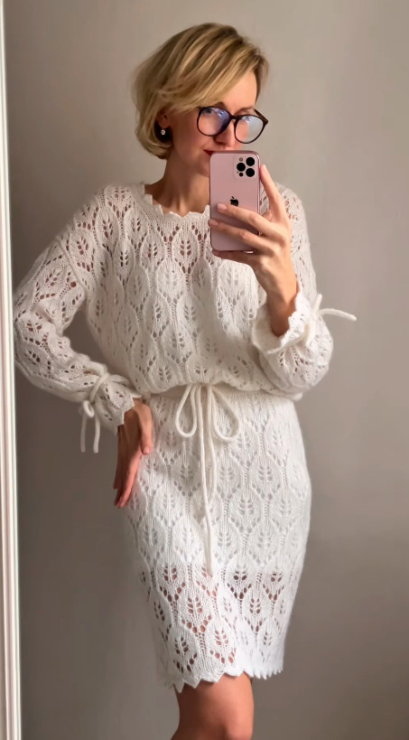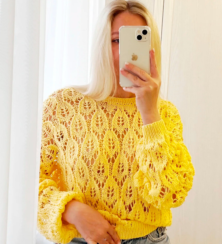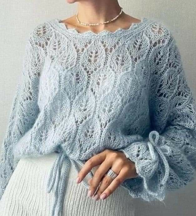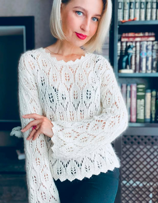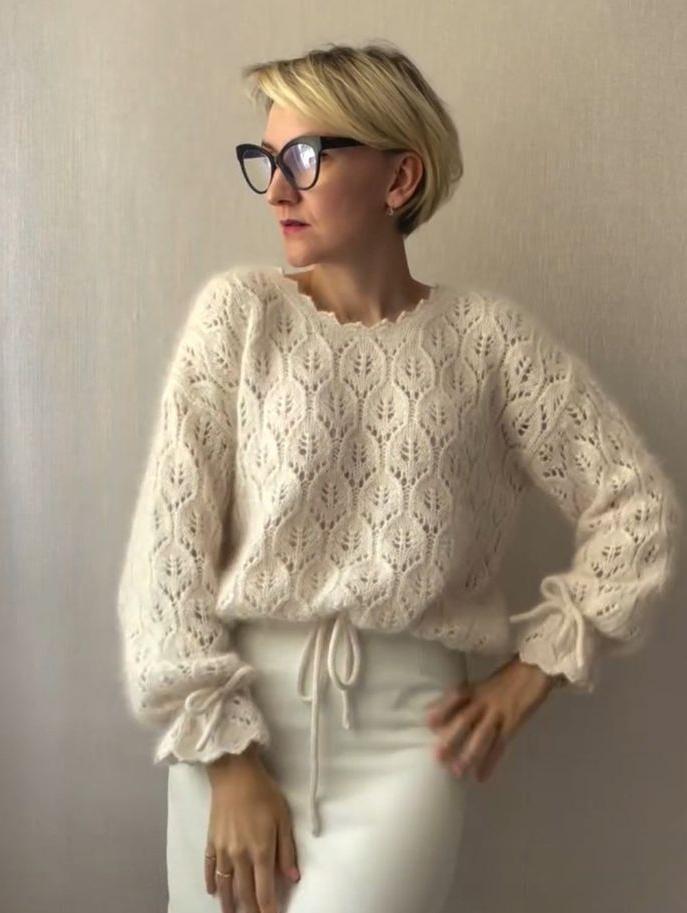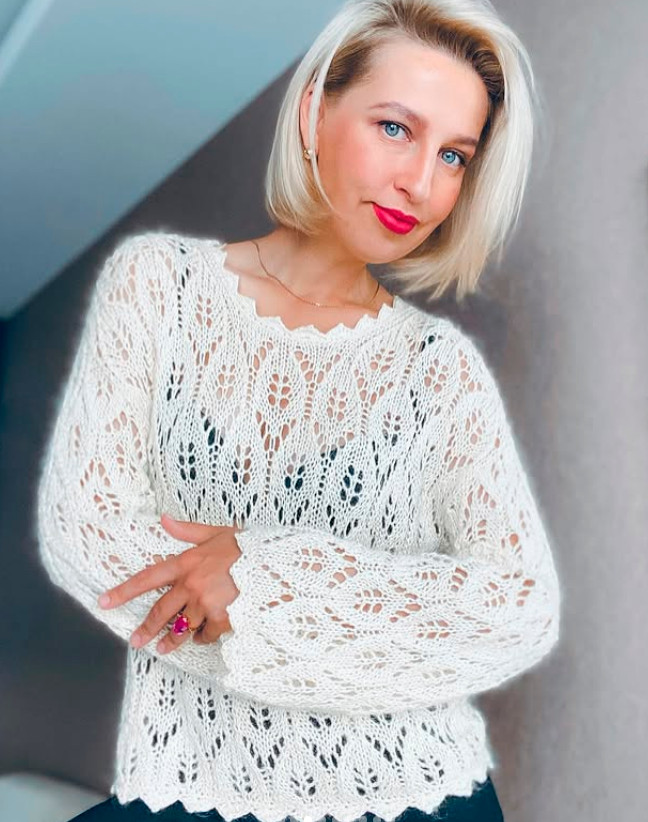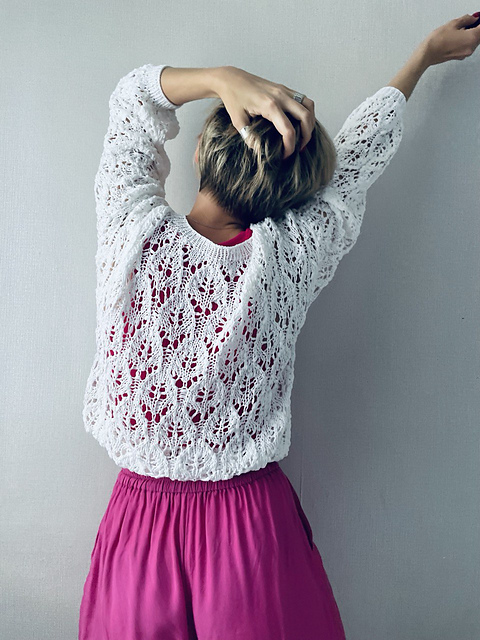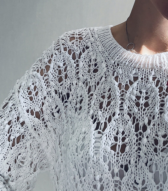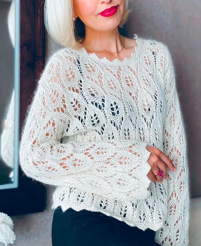 A lace-openwork oversized jumper with a straight cut. The front, back, and sleeves are completely worked in the pattern.