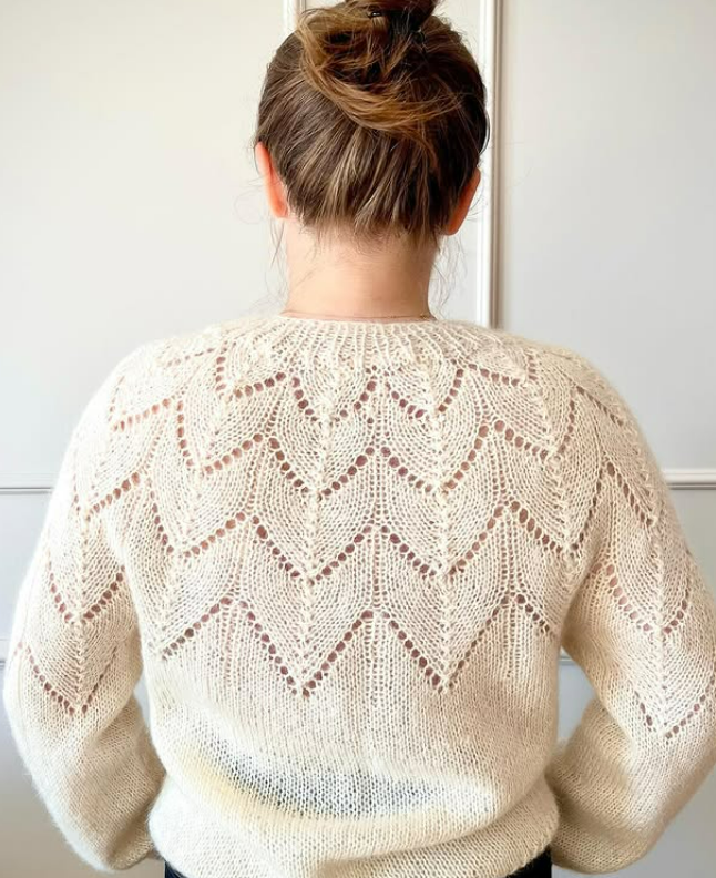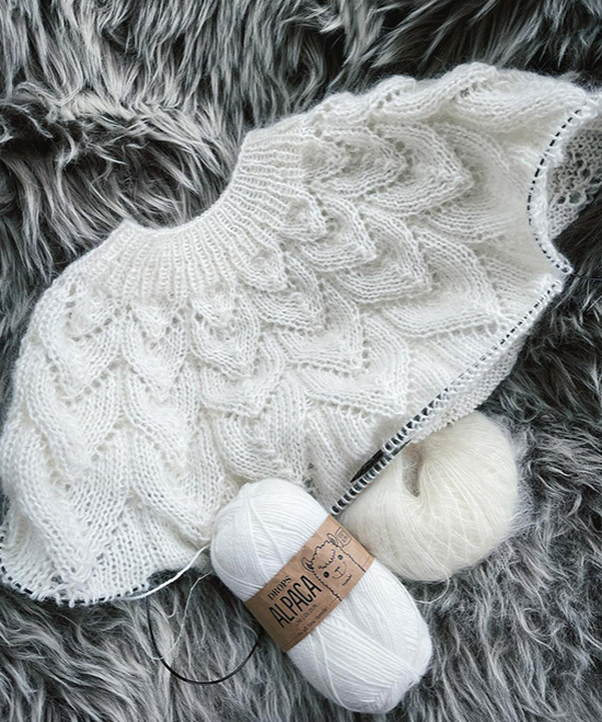 The neck and yoke are worked in the round with circular needle, top down. The yoke is divided for body and sleeves and the body is continued in the round. The sleeves are worked in the round with double pointed needles/short circular needle, top down.