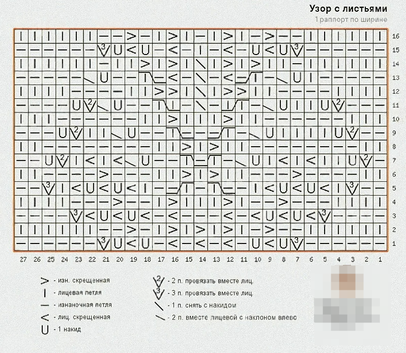 1 вертикальный ажурный столбик, 1 раппорт листиков, 1 вертикальный ажурный столбик, 1 раппорт из скрещенных петель, 1 вертикальный ажурный столбик, 1 раппорт с листиками, 1 вертикальный ажурный столбик.