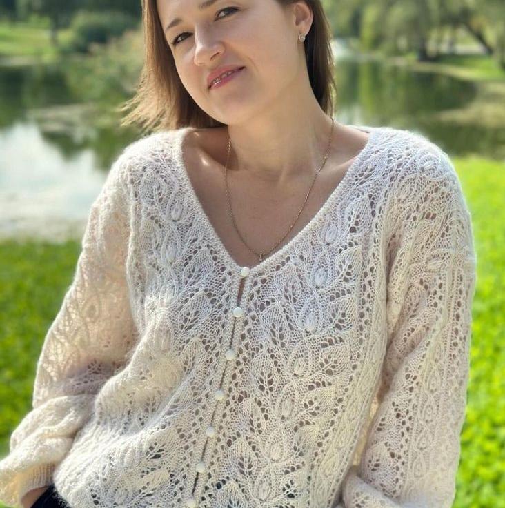 После 9,5 раппортов узора с листиками в высоту, начинаем делать убавления для V- образного выреза горловины. Убавления делала каждые 2 ряда в лицевой ряду, отступив от края 4 петли вместе с кромочной. С этого момента первые 3 изнаночные петли вязала лицевыми,чтобы получить планку. С другой стороны никаких убавлений не было. Вязала прямо до 13,5 раппортов в высоту (по листикам), а затем начала делать скос плеча. Сначала закрывала по 3 петли, затем по 4. Чем ближе к горловине, тем длиннее были закрытия.