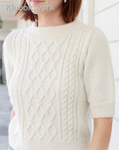 Work sleeves bottom up, and work in the round on needle until armhole, then work sleeve back and forth on needle. Sew parts together. Finish by picking up stitches around the neck and work a neck edge in the round.