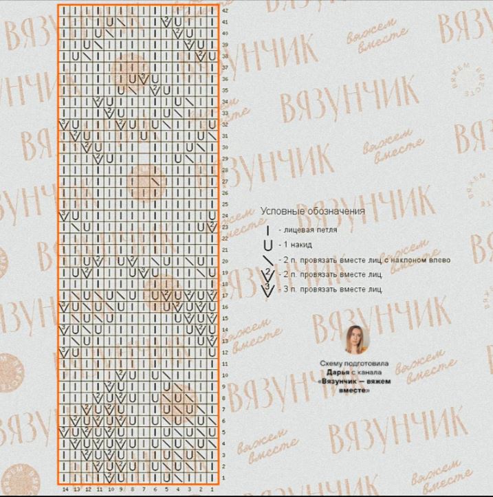 На схеме 1 раппорт в высоту и в ширину. Она для кругового вязания, с изнаночными и лицевыми рядами. Если вам нужно вязать образец, замените все лицевые петли, включая те места, где идут двойные/тройные убавления, на изнаночные.