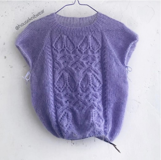 18-ый и все четные ряды вязать по узорам, провязывая накиды, которые вязались до и после петель регланных линий, скрещенной лицевой петлей.