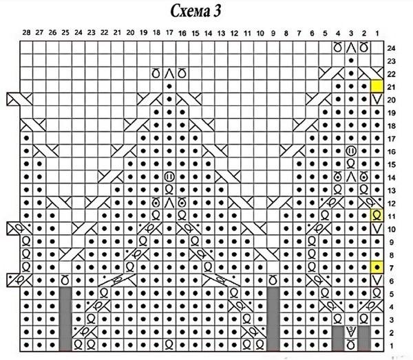 Вязать круг. ряды 1-24 схемы 3 до конца, прибавляя в круг. рядах 1, 2 и 6 как указано. 252 (280, 308, 308, 308, 336, 336, 336, 364, 364, 364) петель. Оборвать нить.