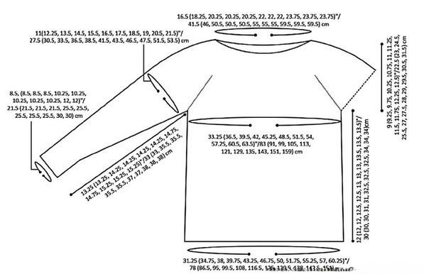 Пуловер разработан с небольшой свободой облегания и глубокими проймами, но вы можете связать его с большей или меньшей свободой облегания.