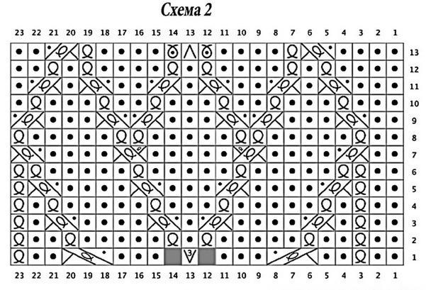 Вязать круг. ряды 1-13 схемы 2 до конца, прибавляя в круг. ряду 1 как указано. 207 (230, 253, 253, 253, 276, 276, 276, 299, 299, 299) петель.