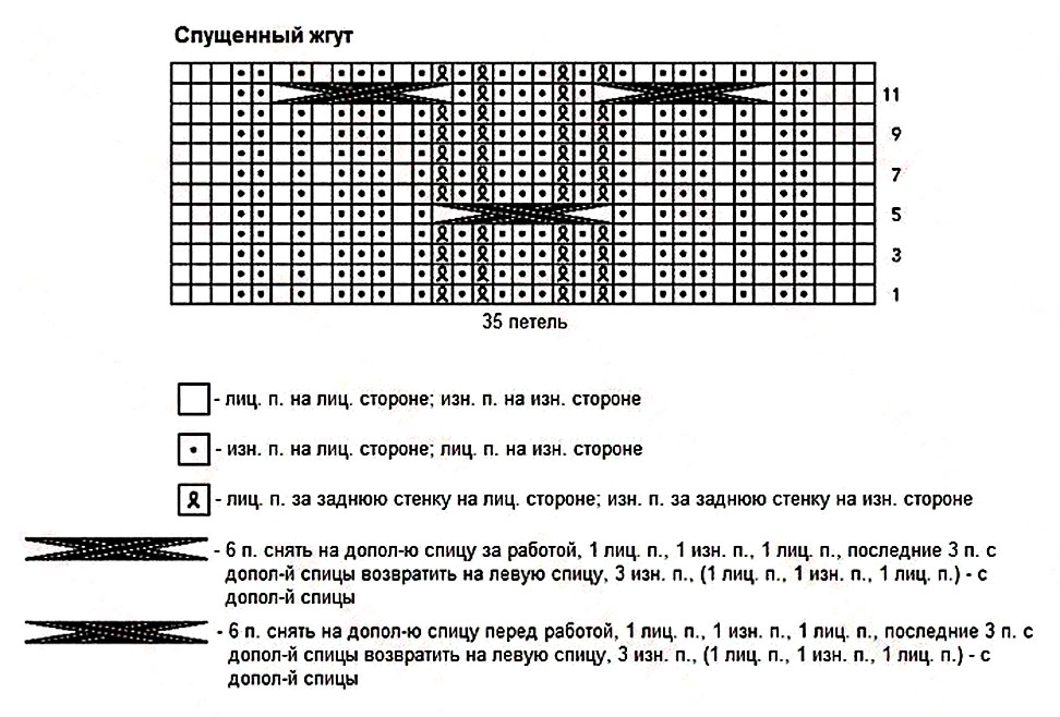 — 6 п. снять на допол.ю спицу за работой, 1 лиц. п., 1 изн. п., 1 лиц. п., последние 3 п. с допол.й спицы возвратить на левую спицу, 3 изн. п., (1 лиц. п., 1 изн. п., 1 лиц. п.) – с допол.й спицы