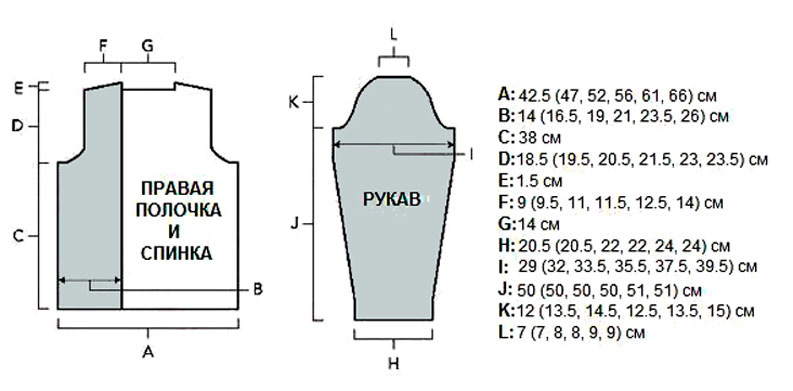 Плотность вязания: 20 петель и 27 рядов = 10 см лицевой глади, выполненной спицами № 4.5;