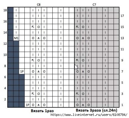 Далее, вязать по графическим схемам: A18 (A18) C17 (C17) A18.
