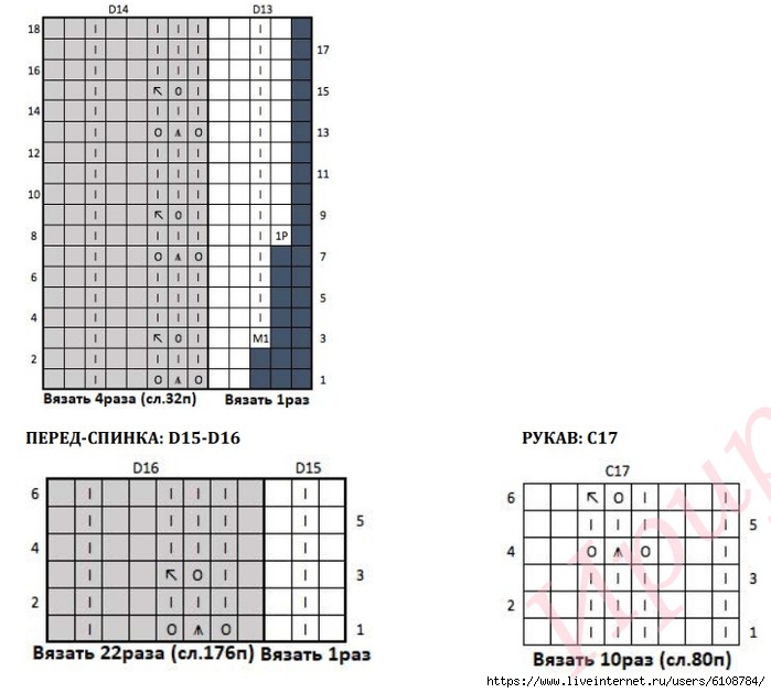 Повторить вертикальный раппорт схемы - всего 11 (12) 12 (13) 13 раз (или вязать, пока высота Рукава, считая от проймы, не составит 38 (41) 41 (44) 44см).