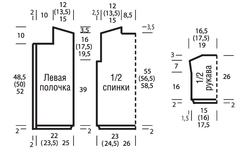 Для скоса рукава прибавить с обеих сторон через 16 см = 60 рядов от планки 1 х 1 п., затем в каждом 8-м ряду 3 х 1 п. и провязывать узором 2 = 93 (99) 105 п. Для низкого оката рукава закрыть через 23 см = 86 рядов от планки с обеих сторон 1 х 4 п., затем в каждом 2-м ряду закрыть 4 х 4 п.