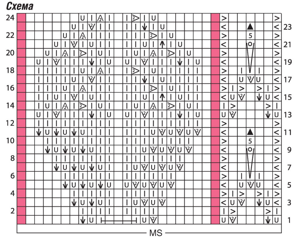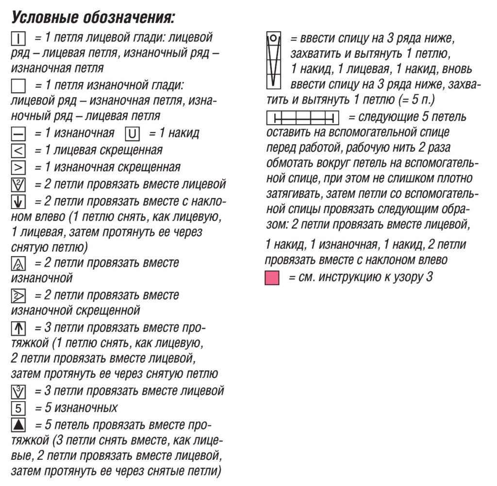 ⟞ = следующие 5 петель оставить на вспомогательной спице перед работой, рабочую нить 2 раза обмотать вокруг петель на вспомогательной спице, при этом не слишком плотно затягивать, затем петли со вспомогательной спицы провязать следующим образом: 2 петли провязать вместе лицевой, 1 накид, 1 изнаночная, 1 накид, 2 петли провязать вместе с наклоном влево