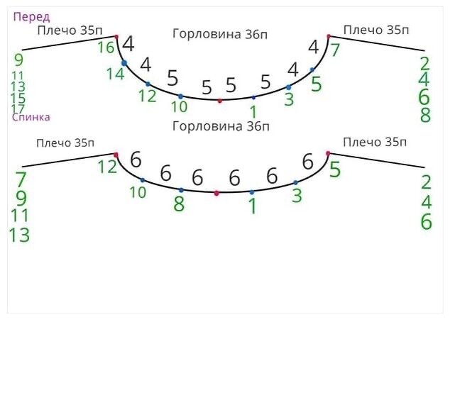Затем формируем горловину укороченными рядами, в карусели схема. Зелёным цветом указаны точки разворота вязания.