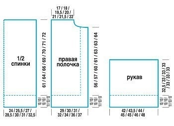 На спицы набрать 39/41/43/45/47/49/51 п. и для нижней планки крупным жемчужным узором вязать 10/10/10/10/11/13/13 см. В след. р. (лиц. сторона) распределить петли: 10/10/10/10/12/12/12 п. крупным жемчужным узором (= вертикальная планка полочки), 29/31/33/35/35/37/39п. лиц. гладью и вязать прямо в заданной последовательности. На высоте 52/24/56/57/59/59/61 см от планки (лиц. сторона) выполнить отверстие для пуговицы: провязать крупным жемчужным узором 4/4/4/4/5/5/5 п., закрыть следующие 3 п. Продолжить вязать по рисунку до конца р., в след. ряду закрытые петли заново набрать, продолжить вязать по рисунку. На высоте 56/57/60/61/63/63/64 см от планки (лиц. сторона) для формирования выреза горловины закрыть справа сначала 10/10/10/10/12/12/12 п. Для закругления выреза горловины закрыть в каждом 2-м р. 1 х 3/3/3/3/3/3/4 п., 1 х 2/2/2/3/2/3/3 п. и 1 х 2 п. На высоте спинки закрыть оставшиеся п. плеча.