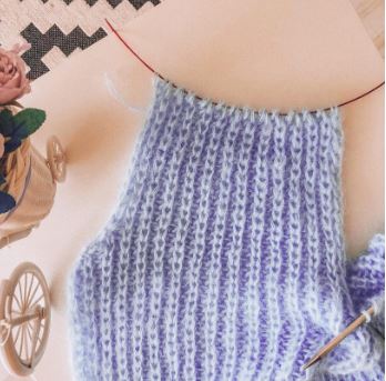 Вяжем резинку 1х1 (первый ряд у нас получается с изнаночной стороны, все петли (кроме петель горловины) в этом ряду провязываем скрещенными за заднюю стенку).