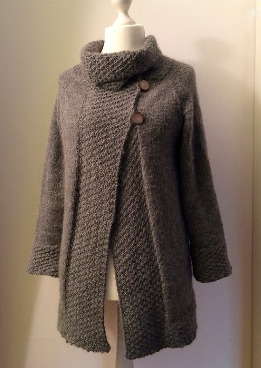 Collar: Pick up approx. 36 to 42 sts between the markers at the neck line (i.e do not pick up sts in the outer most 16 sts each side toward the front edges). Knit 2 rows of garter sts – on the last row inc 12 sts evenly distributed = 48-54 sts.