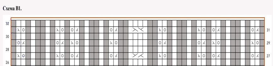 вяжите ломаной резинкой до М, см, вяжите соответствующий ряд Схемы B1, см, вяжите ломаной резинкой до М, ПЦП, см,