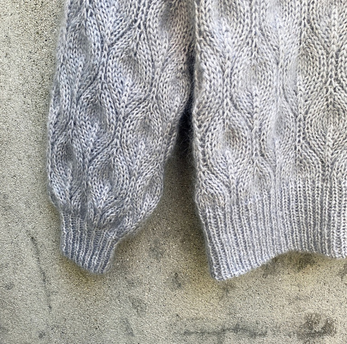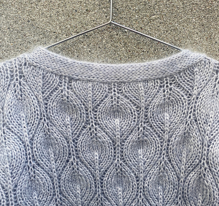 Пряжа: 1 нить Knitting for Olive Merino (250 м/ 50 г), пряжи fingering-weight, 4 (5, 5, 5, 5, 6, 6, 6) мотка + 2 нити Knitting for Olive Soft Silk Mohair (225 м/ 25 г), пряжа lace-weight, 9 (9, 10, 10, 11, 11, 12, 12) мотков. Пример связан из пряжи Merino, Pearl Grey + Soft Silk Mohair, Soft Blue