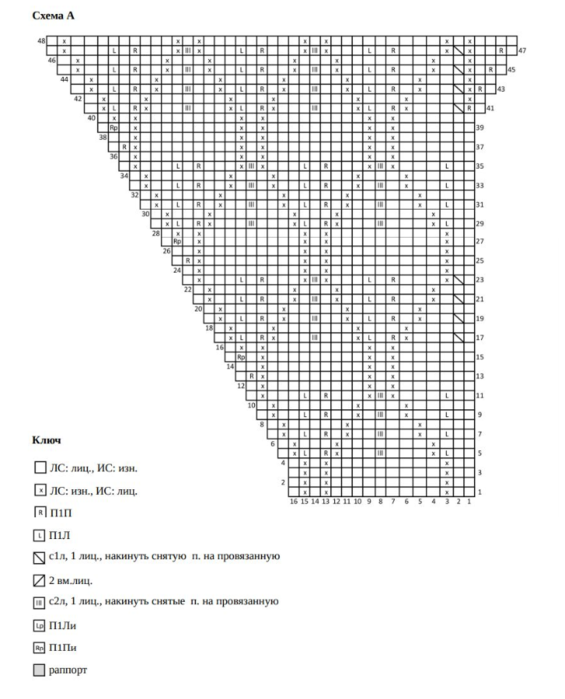 Начав с Ряда 1 и закончив Рядом 48, вязать Схему A на всех п., 1 раз [26 п. прибавлено].