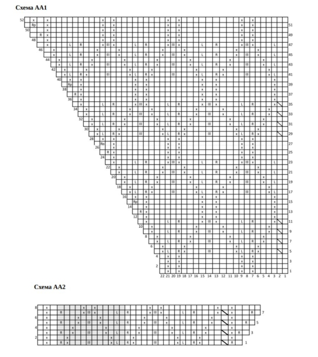 Начав с Ряда 1 и закончив Рядом 52, вязать Схему AA1 на всех п., 1 раз [24 п. прибавлено] Начав с Ряда 1 и закончив Рядом 8, вязать Схему AA2 на всех п., 1 раз [4 п. прибавлено].