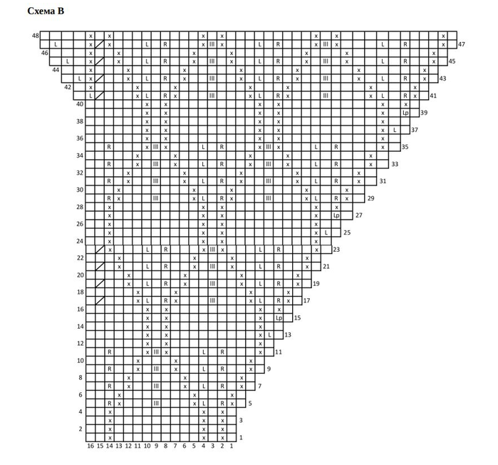 Начав с Ряда 1 и закончив Рядом 48, вязать Схему B на всех п., 1 раз [26 п. прибавлено].