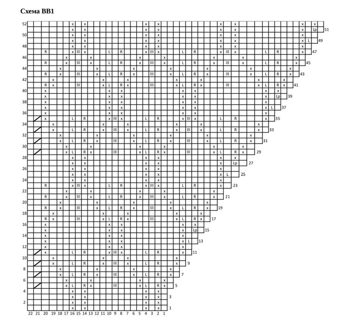 Начав с Ряда 1 и закончив Рядом 52, вязать Схему BB1 на всех п., 1 раз [24sts прибавлено].