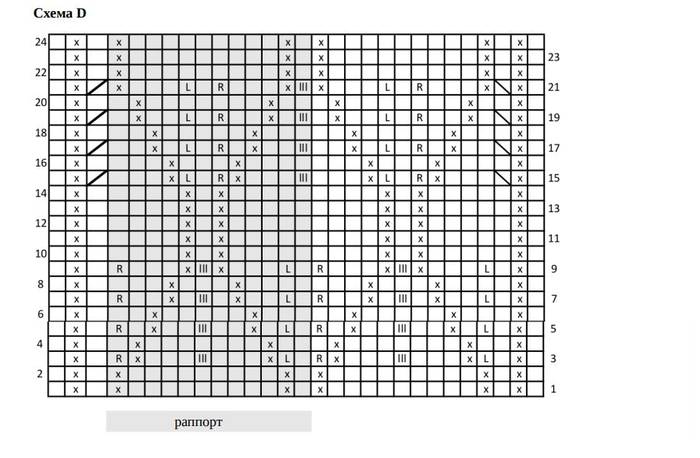 Начав с Ряда 3 и закончив Рядом 24, вязать Схему D на всех п., 1 раз.