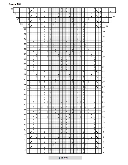 При работе со схемами, всегда начинайте с нижнего правого угла с первой петли 1-го ряда (если в описании не указано иное) и работайте со схемой снизу вверх. Если вы работаете в круг.р., работайте со схемой справа налево во всех круг.р. Если вы вяжете поворотными рядами, читайте схему справа налево в нечетных рядах (ЛС) и слева направо в четных рядах (ИС). Если на схеме есть серая секция, указывающая на раппорт, то вы начинаете с петель белой секции в правой части схемы и сначала выполняете их один раз. Затем вы вяжете и повторяете серый участок столько раз, сколько возможно, и заканчиваете тем, что один раз провязываете последний белый участок в левой части схемы. По мере увеличения количества петель вы постепенно выполняете дополнительные раппорты по мере необходимости.