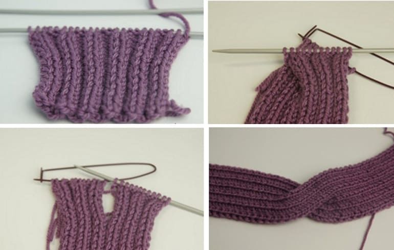 Провяжите 20-22 см, затем разделите петли пополам и продолжайте вязать каждую половину отдельно в длину примерно 6 см.