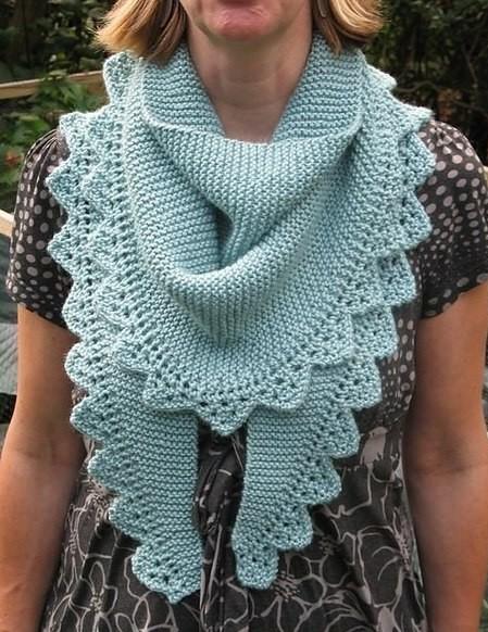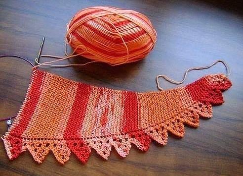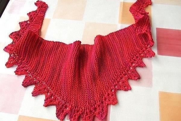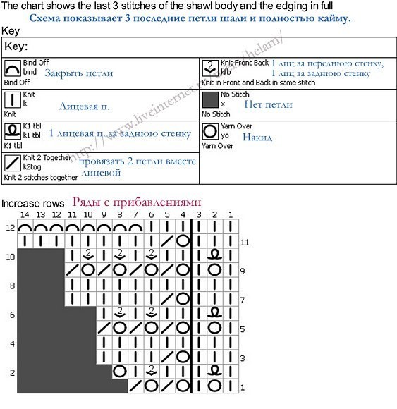 Маленькая треугольная шаль-шарфKlubokhttp://klubok.work/1/201/7511/Klubokhttps://klubok.work/css/image/top-logo-en.pngМаленькая треугольная шаль-шарф вяжется поперек, начиная с угла. Ажурная кайма вяжется одновременно с шалью. Очень простая шаль - подходит для начинающих вязальщиц! Вам потребуется: 100гр. носочной пряжи(400м),круговые спицы 3 и 3,5 мм, 1 маркер для петель. Описание работы. ИС-изнаночная сторона ЛЦ-лицевая сторона Набрать 7 петель. ИС ряд: 4 лиц, поставить маркер, 3 лиц Ряд 1 (ЛС): лиц до 1 п перед маркером, накид, 1 лиц, перекинуть маркер; накид, 2 вместе лиц, накид, 2 вместе лиц Ряд 2 (ИС): накид, 1 лиц, провязать накид за переднюю и заднюю стенку (2 п), 2 лиц, перекинуть маркер; 1 лиц,провязать накид лицевой за заднюю стенку, 1 лиц Ряд 3 (ЛС): лиц до маркера, перекинуть маркер; накид, 2 вместе лиц, 1 лиц Ряд 4 (ИС): 6 лиц, переснять маркер; 1 лиц Ряд 5 (ЛС): лиц до 1 п перед маркером, накид, 1 лиц, переснять маркер; накид, 2 вместе лиц, накид, 2 вместе лиц, накид, 2 вместе лиц Ряд 6 (ИС): 1 лиц, провязать накид за переднюю и заднюю стенку (2 п), 1 лиц, провязать накид за переднюю и заднюю стенку (2 п), 2 лиц, переснять маркер; 1 лиц, лиц накид за заднюю стенку,1 лиц Ряд 7 (ЛС): лиц до маркера, переснять маркер; накид, 2 вместе лиц, 1 лиц Ряд 8 (ИС): 8 лиц, переснять маркер; 1 лиц Ряд 9 (ЛС): лиц до 1 п перед маркером, накид, 1 лиц, переснять маркер; накид, 2 вместе лиц, накид, 2 вместе лиц, накид, 2 вместе лиц, накид, 2 вместе лиц Ряд 10 (ИС): 1 лиц, провязать накид за переднюю и заднюю стенку (2 п), 1 лиц, провязать накид за переднюю и заднюю стенку (2 п), 1 лиц, про-вязать накид за переднюю и заднюю стенку (2 п), 2 лиц, переснять маркер; 1 лиц, вязать накид лиц за заднюю стенку, 1 лиц Ряд 11 (ЛС): лиц до маркера, переснять маркер; накид, 2 вместе лиц, 1 лиц Ряд 12 (ИС): закрыть 7 п свободно или используя эластичныйметод, 3 лиц, переснять маркер;1 лиц. Повторять эти 12 рядов до тех пор,пока не останется по меньшей мере 50 % пряжи(можно взвесить); закончить 12 рядом. Теперь выполнить ряды с убавлениями: Ряд 1(ЛС): лиц до 3 п перед маркером, 2 вместе лиц, 1 лиц, переснять маркер; накид, 2 вместе лиц, накид, 2 вместе лиц Ряд 2 (ИС): накид, 1 лиц, провязать накид за переднюю и заднюю стенку (2 п), 2 лиц, пере-снять маркер; лиц Ряд 3 (ЛС): лиц до маркера, переснять маркер; накид, 2 вместе лиц,1 лиц Ряд 4 (ИС): 6 лиц, переснять маркер;1 лиц Ряд 5 (ЛС): лиц до 3 п перед маркером, 2 вместе лиц, 1 лиц, переснять маркер; накид, 2 вместе лиц, накид, 2 вместе лиц, накид, 2 вместе лиц Ряд 6 (ИС): 1 лиц, провязать накид за переднюю и заднюю стенку (2 п), 1 лиц, провязать накид за переднюю и заднюю стенку (2 п), 2 лиц, пере-снять маркер; 1 лиц Ряд 7 (ЛС): лиц до маркера, переснять маркер; накид, 2 вместе лиц,1 лиц Ряд 8 (ИС): 8 лиц, переснять маркер; 1 лиц Ряд 9 (ЛС): лиц до 3 п перед маркером, 2 вместе лиц, 1 лиц, переснять маркер; накид, 2 вместе лиц, накид, 2 вместе лиц, накид, 2 вместе лиц, накид, 2 вместе лиц Ряд 10 (ИС): 1 лиц, провязать накид за переднюю и заднюю стенку (2 п), 1 лиц, провязать накид за переднюю и заднюю стенку (2 п), 1 лиц, провя-зать накид за переднюю и заднюю стенку (2 п), 2 лиц, переснять маркер; 1 лиц Ряд 11 (ЛС): лиц до маркера, переснять маркер; накид, 2 вместе лиц, 1 лиц Ряд 12 (ИС): закрыть 7 п свободно или используя эластичныйметод, 3 лиц, переснять маркер;1 лиц. Повторять эти 12 рядов пока не останется 3 петли перед маркером в 11-ом ряду(ЛС). Закрыть последние 12 петель в следующем 12-ом ряду (ИС). Спрятать концы нитей, замочить шаль в воде на 20 минут и затем завернуть в 