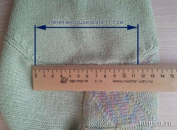 - ещё одна нужная величина - это ширина прямой линии на верхушке оката. Раскладываю рукав так, чтобы линия плеча оказалась по центру и измеряю нужную величину - 11,5 см. Если обратиться к теории построения оката, я встречала рекомендацию делать ширину линии на верхушке оката = 5-6 см. Возможно, это классический окат рукава, но у меня к такому душа не лежит, как и не нравится измеренная величина в готовой кофточке, поэтому я позволю её себе уменьшить и сделать = 9 см, что в перерасчёте на петли = 19 петель.