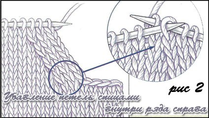 Для завершения проймы убавляйте 1 — 2 петли после 2х или 3х крайних петель ряда. На правой стороне работы (в начале ряда) провяжите 2 — 3 петли по узору и затем 2 — 3 петли вместе с наклоном влево. Для этого снимите петлю как при лицевом вязании не провязывая, 1 лиц, протяните лицевую через снятую петлю. (Рис 2.)