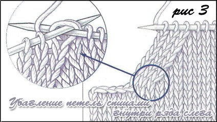 На лицевой стороне работы (в конце ряда) вяжите по рисунку до 4 — 5 последних петель. Далее провяжите 2 — 3 петли вместе лицевыми, затем последние 2 -3 петли провяжите по узору. (Рис 3.)