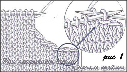 На лицевой стороне изделия закройте первые петли (количество петель указано в описании работы). Снимите 1 петлю не провязывая, следующую провяжите по узору и протяните ее через снятую. Продолжайте вязание по узору, закончив ряд поверните работу. На изнаночной стороне закрывайте петли таким же образом. (Рис 1.)