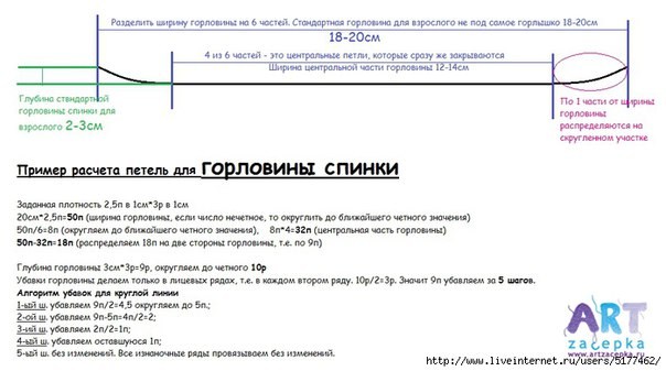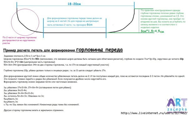 Данный расчет приведен для формирования классической круглой горловины. Но вы можете углублять и расширять ее - оформление скругленных участков останется прежним.