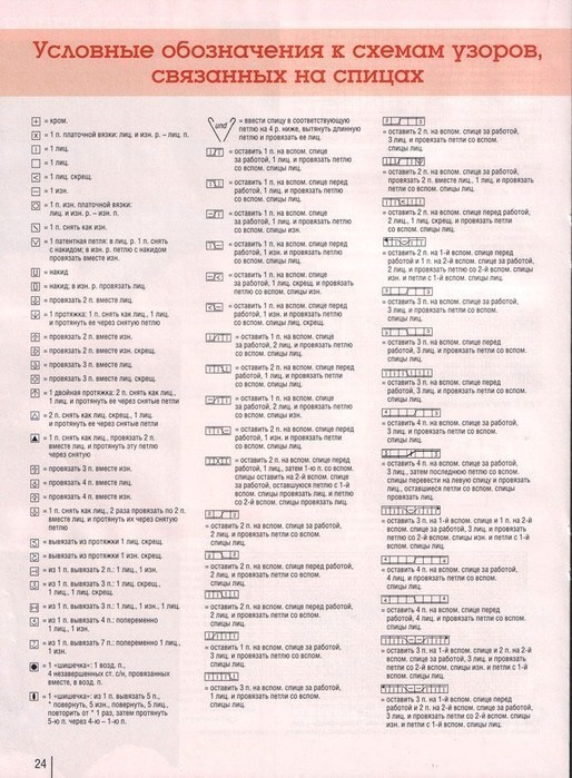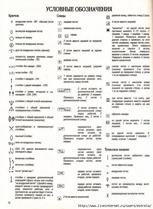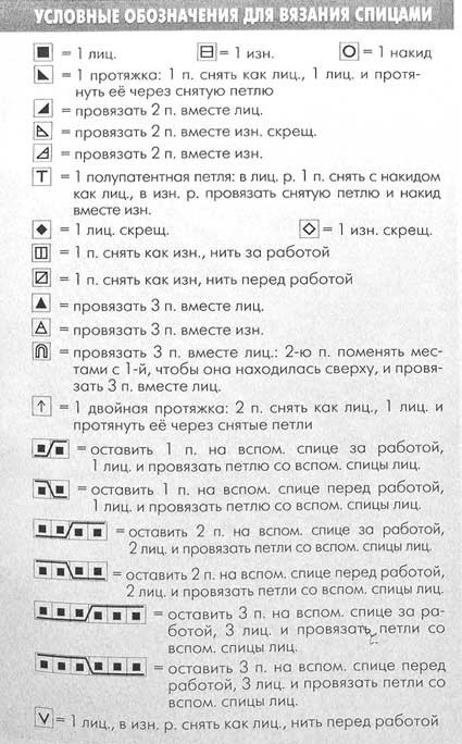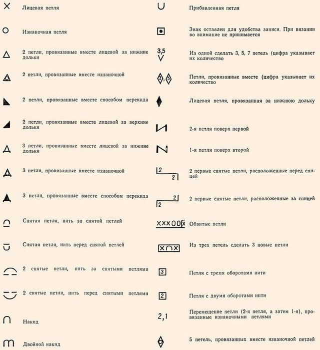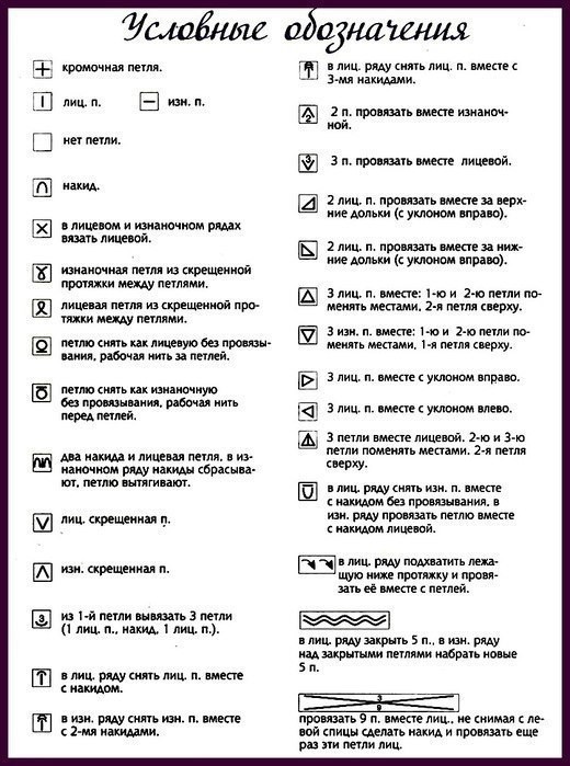 Как читать схемы вязания? Встречаются два типа схем – это графические схемы обозначения узоров и схемы-описания. Графическая запись вязаных узоров обладает преимуществами, такими как удобство в работе, наглядность, компактность. Нарисованную символами схему могут использовать люди, даже незнающие иностранных языков. Но у графической записи имеются и недостатки: нет единых правил для обозначения каждого вида петель, поэтому схема узора требует расшифровки условных обозначений; в чтении схем нужно иметь навык; некоторые особенности вязки нуждаются в дополнительном текстовом пояснении. В наше время схемы узоров все чаще выполняются графическим способом. Обусловлено это тем, что современные модные узоры для воспроизведения требуют много рядов и различных петель. Если использовать тестовую запись подобного узора, то на это уйдет не одна страница и вся нарядность утратится, а вероятность ошибки возрастет, ошибку будет трудно найти и исправить. Схемы вязания крючком Разберем, как читать схемы вязания крючком. Каждый узор всегда имеет конкретное число петель и рядов, как по ширине, так и по высоте. Количество нечетных петель с права схемы показывают, как выполняются лицевые ряды, направленные прямо. Количество четных петель слева схемы – изнаночные ряды, направленные обратно. Простые рисунки могут быть объяснены только раппортом, а для узоров повышенной сложности, к которым относятся кружевные узоры, требуются длинные и не всегда понятные описания. Поэтому для вязания сложных узоров легче пользоваться схемой. В схеме показано, какие нужно вязать петли, и как их расположить. Схема обычно напоминает законченную работу, ведь символ в схеме примерно равен по размеру одной петле. Схемы обычно читают снизу и двигаясь наверх. А вот первый ряд читают справа налево, следующий слева направо, дальше таким же образом; круговые ряды нужно читать справа налево. Используя условные обозначения на схемах, выполняется раппорта. Основные виды петель на схемах представляются в виде таких символов: - овал – воздушная петля, - закрашенный овал – полустолбик без накида, - крестик – столбик без накида, - Т – полустолбик с накидом, - Т с перекрестной линией – столбик с одним накидом, - Т с двумя перекрестными линиями – столбик и два накида, - Т с тремя перекрестными линиями – столбик и три накида. Перед тем, как начать вязать узор, нужно внимательно рассмотреть схему и связать образец. Так же на схемах бывают дополнительные условные знаки и обозначения, например: закрашенная стрелочка, она обозначает начало работы при круговом вязании, не закрашенная стрелочка – место соединения фрагментов, изогнутая стрелочка показывает направление работы. При круговой вязке описываются первые ряды, начало которых отмечают на схеме цифрой. Выполняя круговую вязку, на схеме показывается лишь несколько повторяющихся фрагментов, в форме клина. В описании обычно отмечается количество повторений этих клиньев. Схемы вязания спицами Рассмотрим как научиться читать схемы вязания спицами. Мастерицам чаще всего приходится знакомиться с новым узором несколькими способами: из подробного описания всех провязанных петель и в виде схемы. Впервые столкнувшись со схемой, нужно знать, как читать схемы по вязания спицами. В схеме петли читаются в лицевых рядах, начиная справа