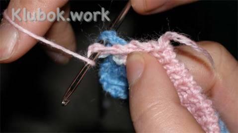 Набираем петли на спицы по петлям тамбурного шва с изнаночной стороны.