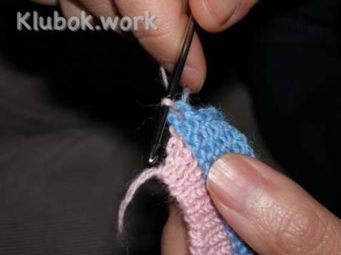 Следующий прием - имитация "двойной" или полой резинки. Для этого, по тамбурному шву петли набираем, как с лицевой так и с изнаночной стороны, провязываем примерно 1 см и объединяем оба полотна, провязывая по две петли вместе (по петле с каждого полотна).