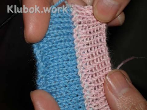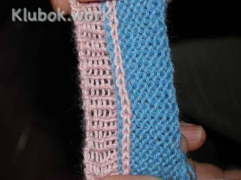 Затем берем дополнительную пару и спиц и набираем петли от другого клубка с изнаночной стороны изделия ( петли набираем из полученной строчки с изнанки), провязываем 6 рядов лицевыми петлями.