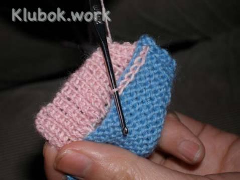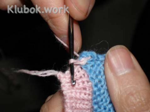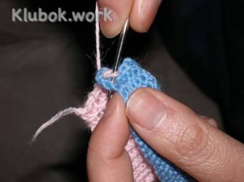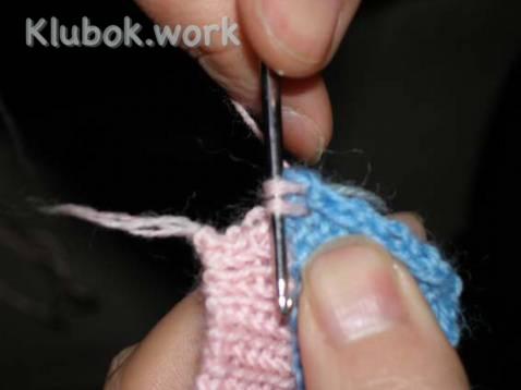 Объединяем полотно лицевой стороны и изнанки, провязывая по две петли вместе от каждого полотна.