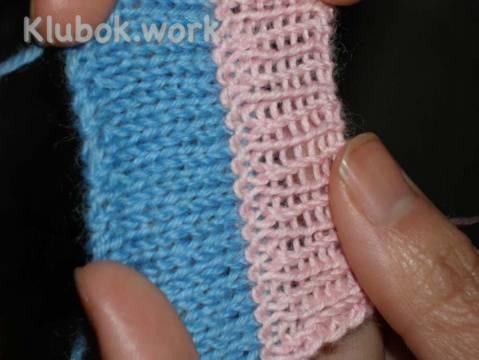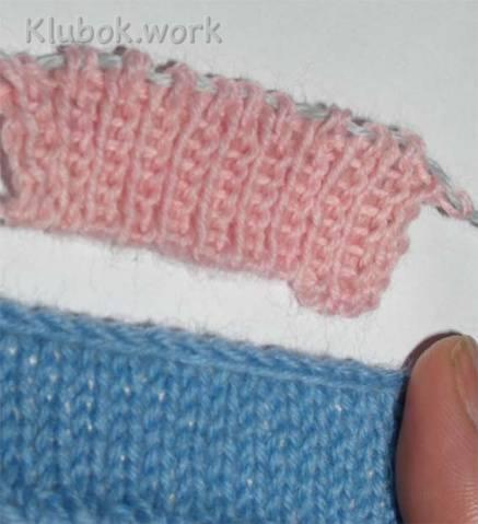 Провязываем примерно 2 см, закрываем бросовой нитью контрастного цвета и перегибаем на лицевую сторону.