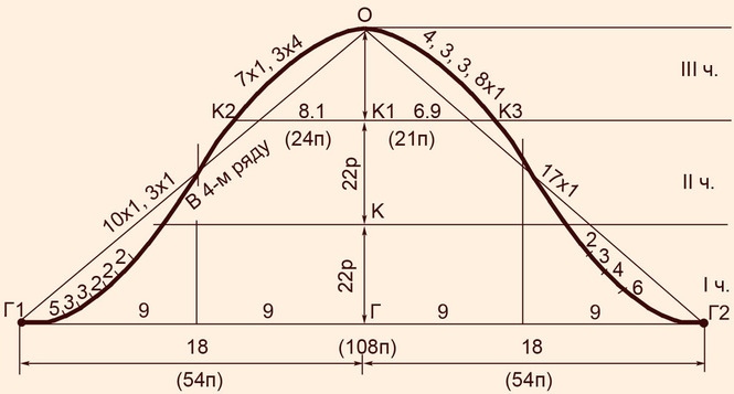 Величину отрезкa Пхп измеряем по готовому чертежу. В нaшем примере П1, n = 1,7 cм, или 3 петли X 1,7 « 5 петель. Тaк же по готовому чертежу измеряем величину отрезкa Γ3п: Γ3и = 13,6 cм, или 4,2 рядaΧ13,6 « ~ 57 рядов.