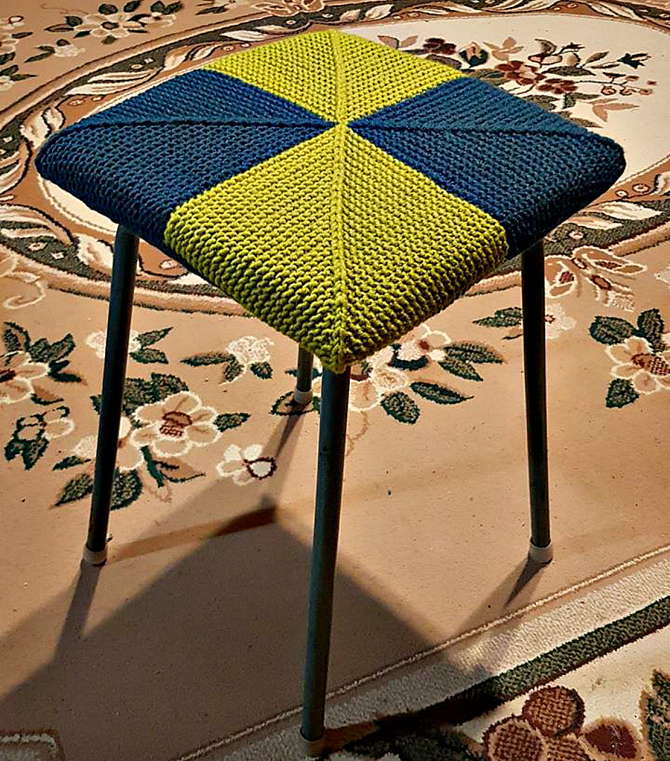 . Когда купили дачный дом, то нам достались старые табуретки, в которых сидушка из фанеры. Сначала купила подушки на них, но очень неудобные, так как больше,чем сиденье. А потом вспомнила, что у прабабушки были вязанные сидушки и решила повторить. Конечно так красиво, как у нее не получилось, но тоже симпотичненько... я так считаю