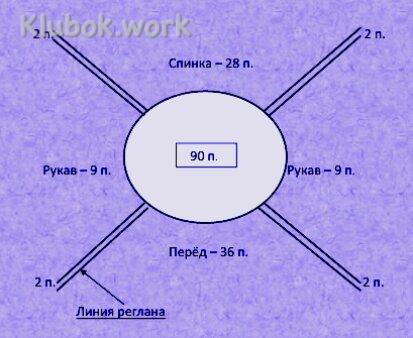 Способ 2. Зная плотность вязания, определяем число петель по основанию шеи и распределяют петли на спинку, перед, рукава и регланные линии. Например, при плотности вязания 2,5 петли в 1 см. и обхвате шеи 36 см. на спицы необходимо набрать 90 петель(2,5х36). Пусть в данном примере каждая регланная полоска состоит из двух петель, тогда 4 полоски - это 8 петель(2*4). Остальные петли делят на три равных части – спинка, перед, рукава.