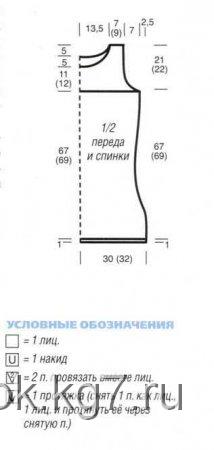 Перед: вязать так же. но с более глубоким вырезом горловины. Для этого через 11 (12) см от начала пройм за-крыть средние 16 п. и вязать далее раздельно. Для закругления по краям выреза закрыть в каждом 2-м р, 1 х 4, 1 х 3, 2 х 2 и 9 х 1 п. На высоте спинки закрыть оставшиеся 16 (20) п. плеча.