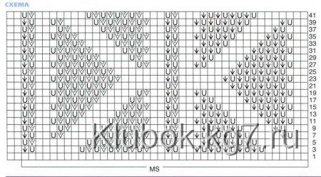 Основной узор: число петель кратно 40 + 2 (0) + 2 кром. Вязать по схеме, на которой приведены только лиц. р,, в изн. р. все петли и накиды вязать изн.