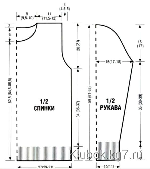 ПЕРЕД: выполнить ту же работу, что и для спинки, но через 52/54/56 см от НР выполнить горловину, убавив 8 центр. п. и закончить каждую сторону отдельно. Продолжить, убавляя в каждом 2 р. 7 x 1 п. / 8 х 1 п. / 9 х 1 п. Останется 20/21/22 п. для плеча и через 60/62/64 см от НР, закрыть все п. одновременно. Вторую часть выполнить зеркально первой.
