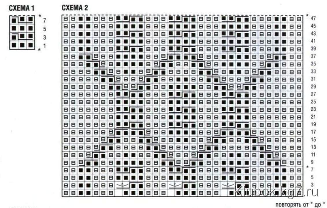 ВОРОТНИК: набрать 73/75/77 п. и вязать витой резинкой 1/1. Через 10 см от НР закончить работу.