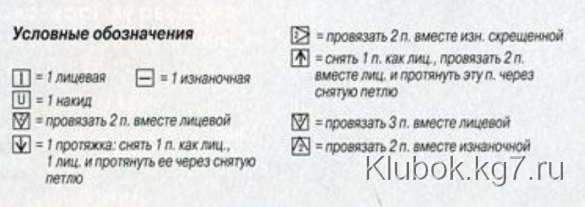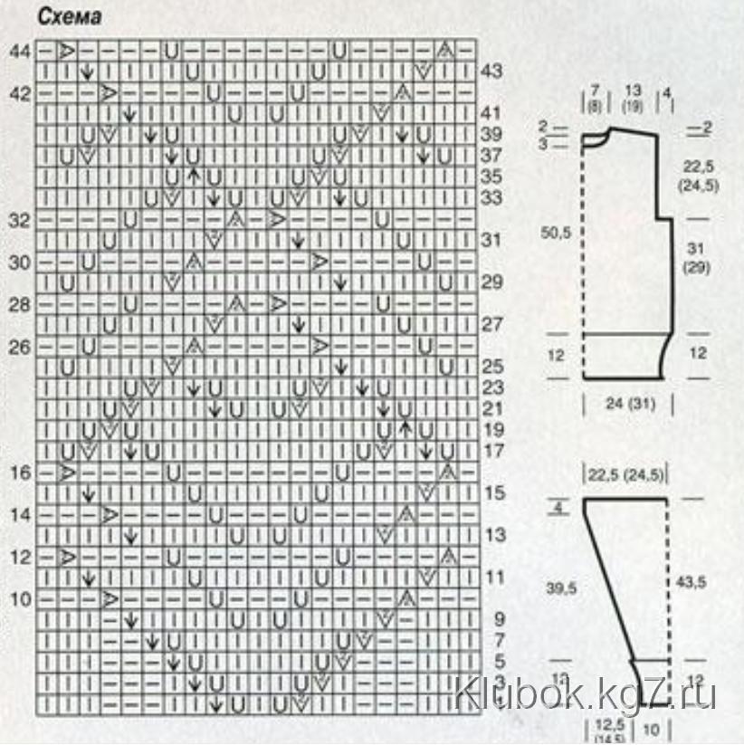 Ажурная полоса (шириной 21 п.): вязать по схеме; в не обозначенных изнаночных р. петли вязать по рисунку, накиды провязывать изнаночными. Повторить 1 разе 1-го по44-й р., затем повторять с 13-го по 44-й р.